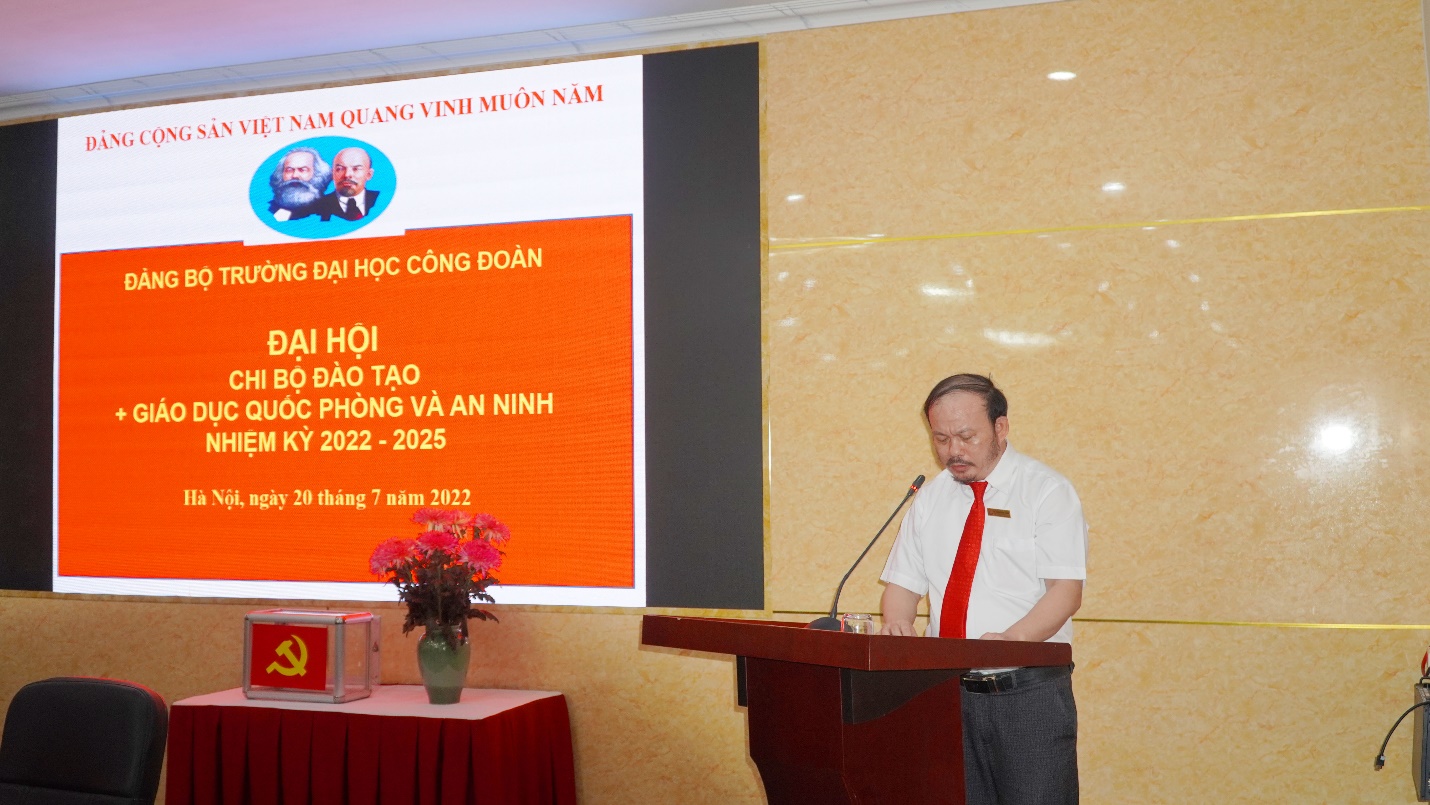 Thực hiện Kế hoạch số 11-KH/ĐU ngày 08/6/2022 của Đảng ủy Trường Đại học Công đoàn về tổ chức Đại hội chi bộ - nhiệm kỳ 2022-2025được sự nhất trí của Đảng bộ Trường Đại học Công đoàn, Chi bộ Đào tạo + Giáo dục Quốc phòng và An ninh tiến hành Đại hội Chi bộ. Đại hội là diễn đàn chính trị quan trọng của Đảng, có nhiệm vụ đánh giá kết quả thực hiện Nghị quyết Đại hội chi bộ Đào tạo + Giáo dục quốc phòng và an ninh và quyết định phương hướng, nhiệm vụ và giải pháp nhằm nâng cao chất lượng hoạt động của chi bộ Đào tạo + Giáo dục quốc phòng và an ninh; đồng thời, bầu chi ủy, bí thư và phó bí thư nhiệm kỳ 2022-2025.