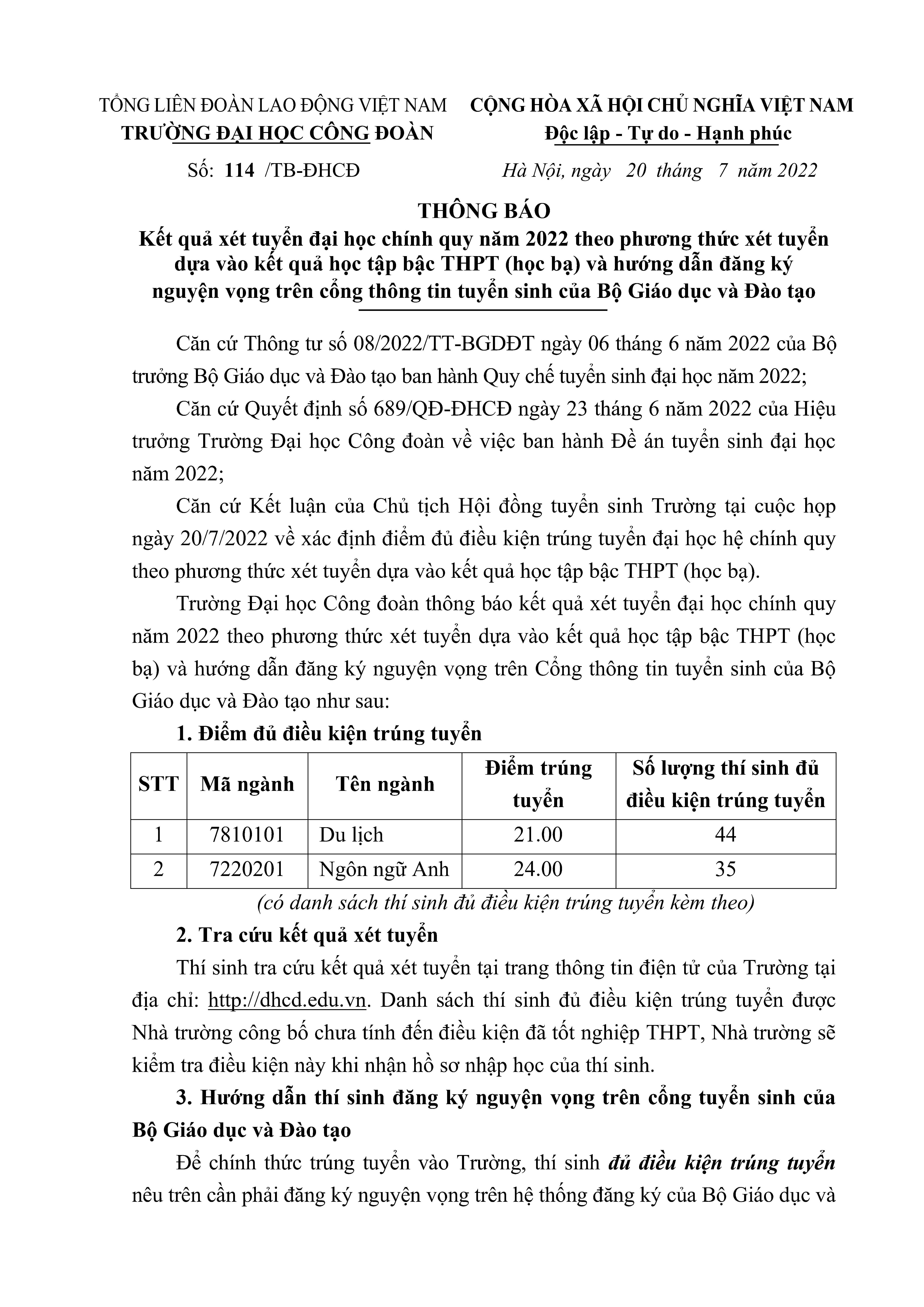 Kết quả xét tuyển Đại học chính quy năm 2022 theo phương thức xét tuyển dựa vào kết quả học tập bậc thpt