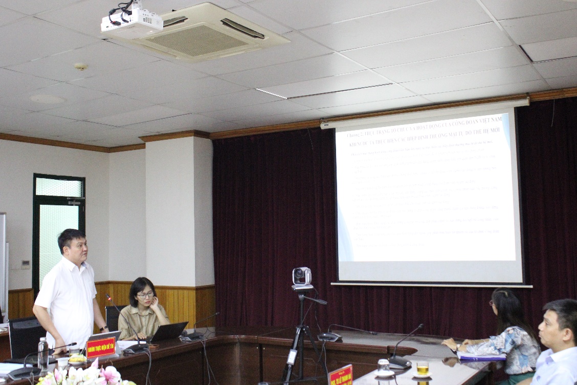 Đại diện cho nhóm nghiên cứu, TS. Lê Cao Thắng - Chủ tịch Hội đồng trường Đại học Công đoàn - chủ nhiệm đề tài đã báo cáo tóm tắt đề tài nghiên cứu, đề ra những khó khăn, những hạn chế trong tổ chức công đoàn nước ta khi tham gia các Hiệp định thương mại tự do thế hệ mới. TS. Lê Cao Thắng nhấn mạnh: để nâng cao năng lực, trình độ cho NLĐ, đánh giá được cơ hội, thách thức của tổ chức, góp phần quan trọng để nâng cao năng lực cạnh tranh quốc gia, Công đoàn Việt Nam với các cơ quan Nhà nước phải luôn phối hợp với nhau trong việc xây dựng chính sách pháp luật có liên quan như các chính sách thu hút đầu tư, chính sách đào tạo nguồn lực, các khung chương trình đào tạo cụ thể, khắc phục những tồn tại hạn chế của nguồn nhân lực, đổi mới nội dung hoạt động công đoàn; tăng cường sự lãnh đạo của Đảng với các hoạt động Công đoàn; các hoạt động bảo vệ quyền và lợi ích chính đáng của người lao động; xây dựng bộ máy tổ chức công đoàn đủ sức đáp ứng nhu cầu nhiệm vụ trong tình hình mới. Đồng thời, cần đẩy mạnh xây dựng, hoàn thiện hệ thống chính sách pháp luật, đẩy mạnh công tác tuyên truyền, xây dựng quan hệ lao động hài hòa tại doanh nghiệp, nâng cao trình độ học vấn, trình độ chuyên môn, kỷ luật cho NLĐ.