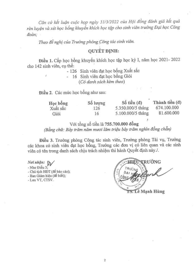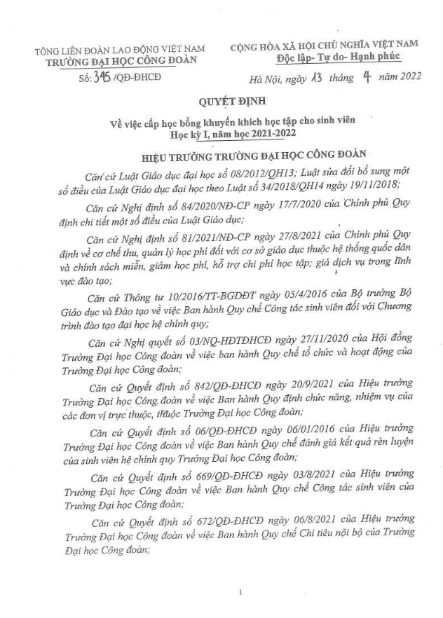 Quyết định về việc cấp học bổng khuyến khích học tập cho sinh viên học kỳ I, năm học 2021-2022