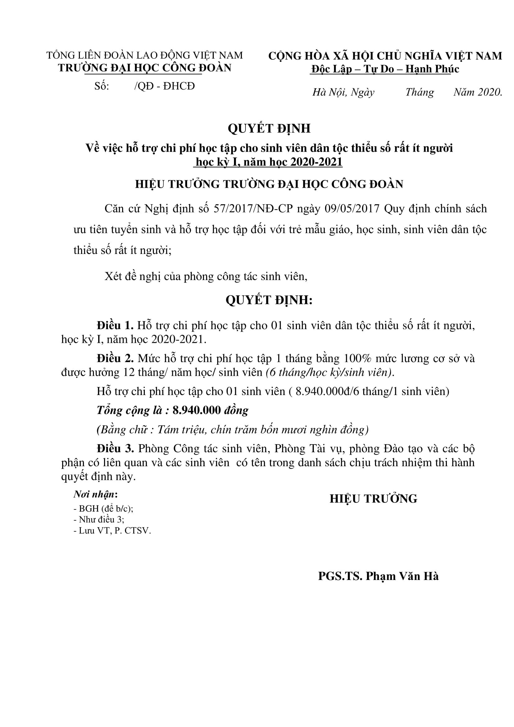 Quyết định về việc hỗ trợ chi phí học tập cho sinh viên Dân tộc Thiểu số rất ít người, Học kỳ I năm học 2020 - 2021