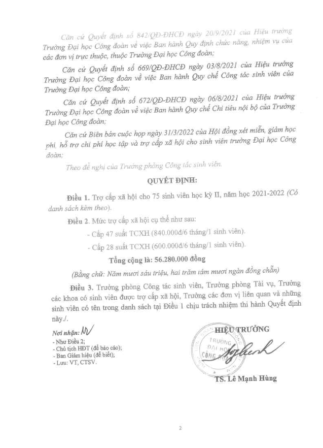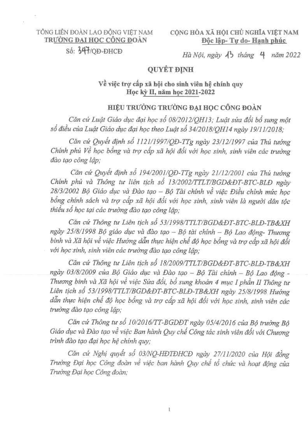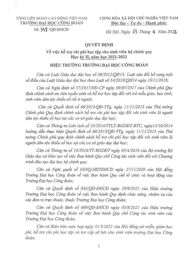 Quyết định về việc miễn,giảm học phí, trợ cấp xã hội, hỗ trợ chi phí học tập, học bổng công đoàn cho sinh viên hệ chính quy, học kỳ II, năm học 2021-2022