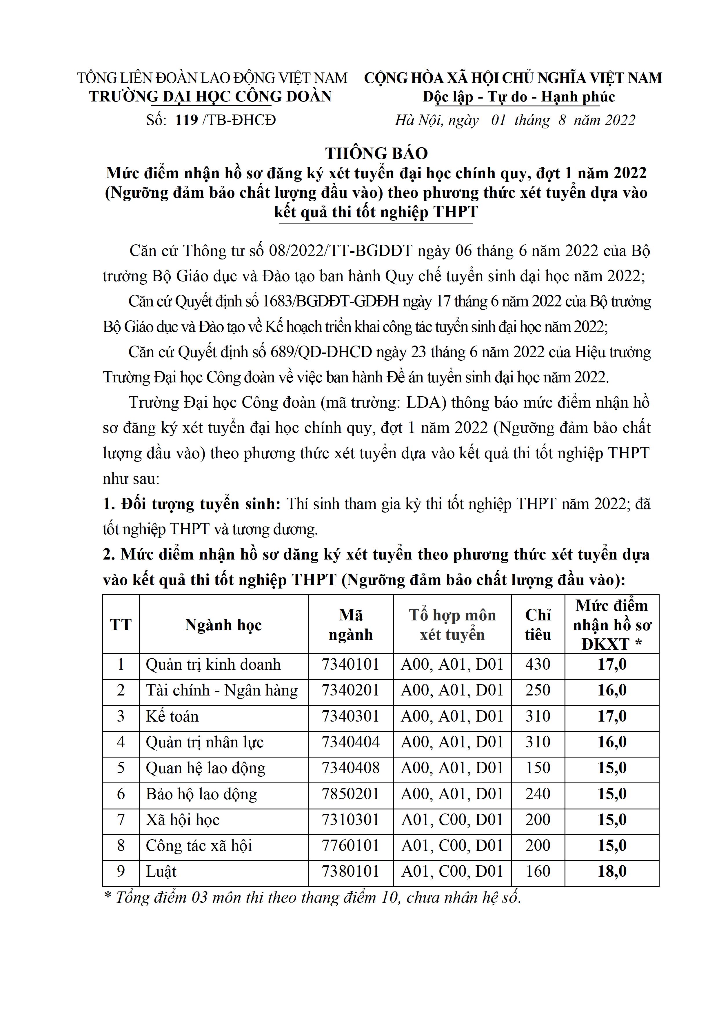 Thông báo mức điểm nhận hồ sơ đăng ký xét tuyển Đại học chính quy, đợt 1 năm 2022 (ngưỡng đảm bảo chất lượng đầu vào) theo phương thức xét tuyển dựa vào kết quả thi tốt nghiệp THPT