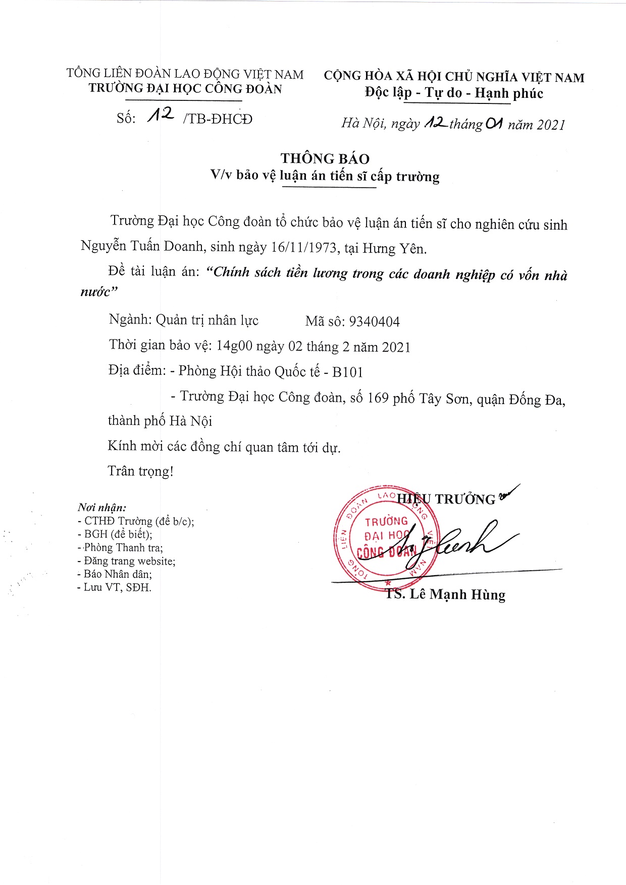 Thông báo về việc bảo vệ luận án cấp trường của NCS Nguyễn Tuấn Doanh