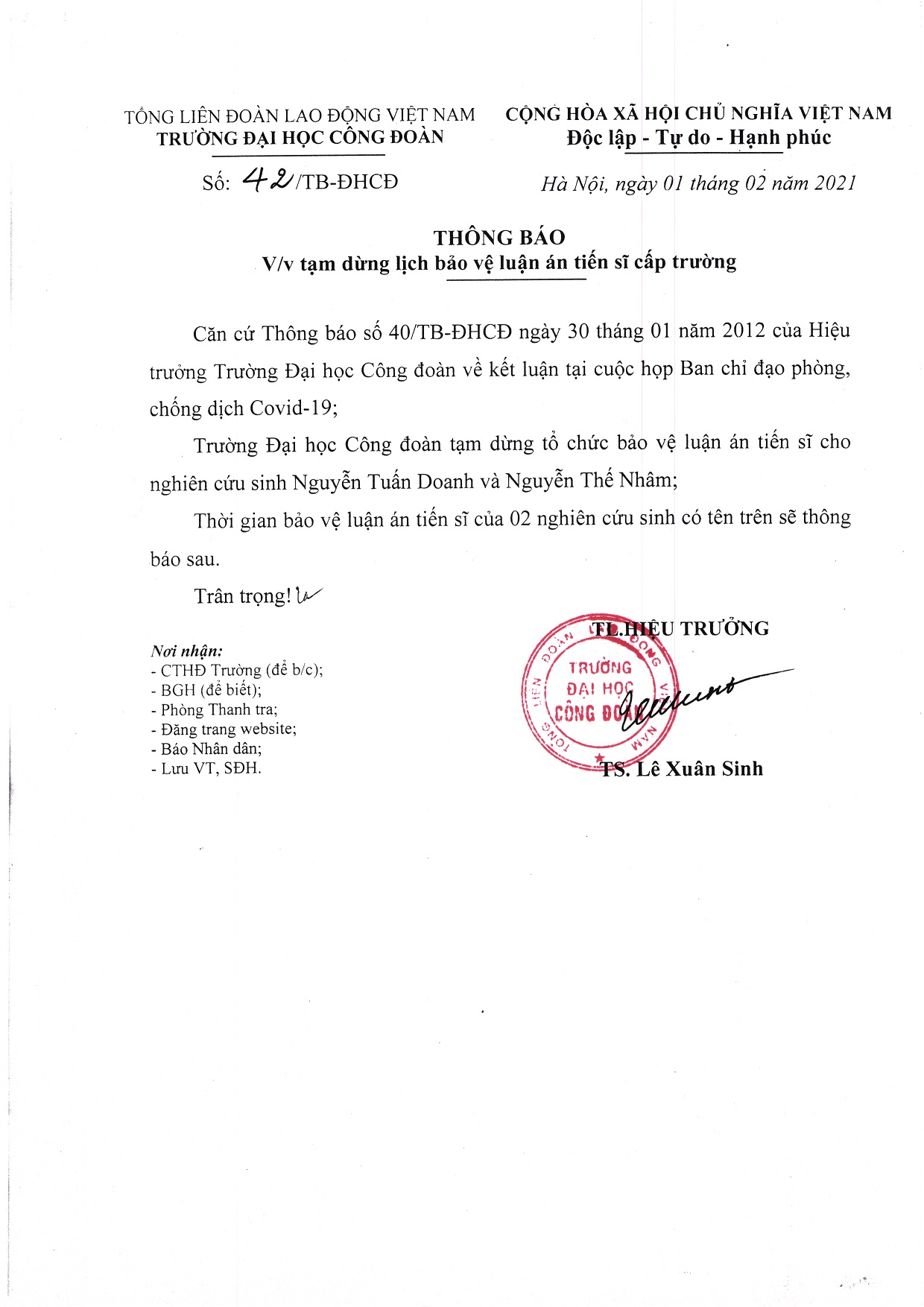 Thông báo về việc tạm dừng lịch bảo vệ luận án tiến sĩ cấp trường