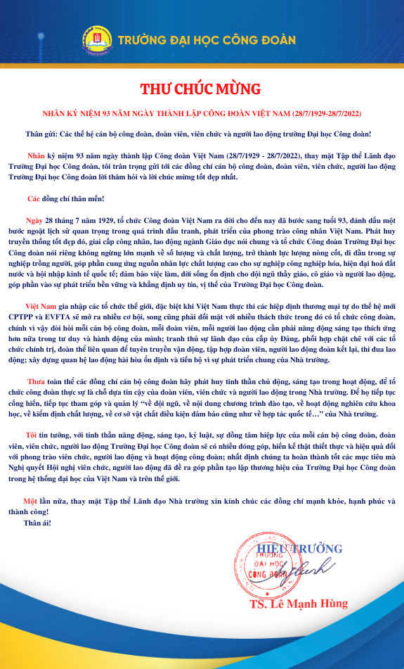 Thư chúc mừng của hiệu trưởng nhân dịp kỷ niệm 93 năm ngày Công đoàn Việt Nam 28-7-1929 - 28-7-2022