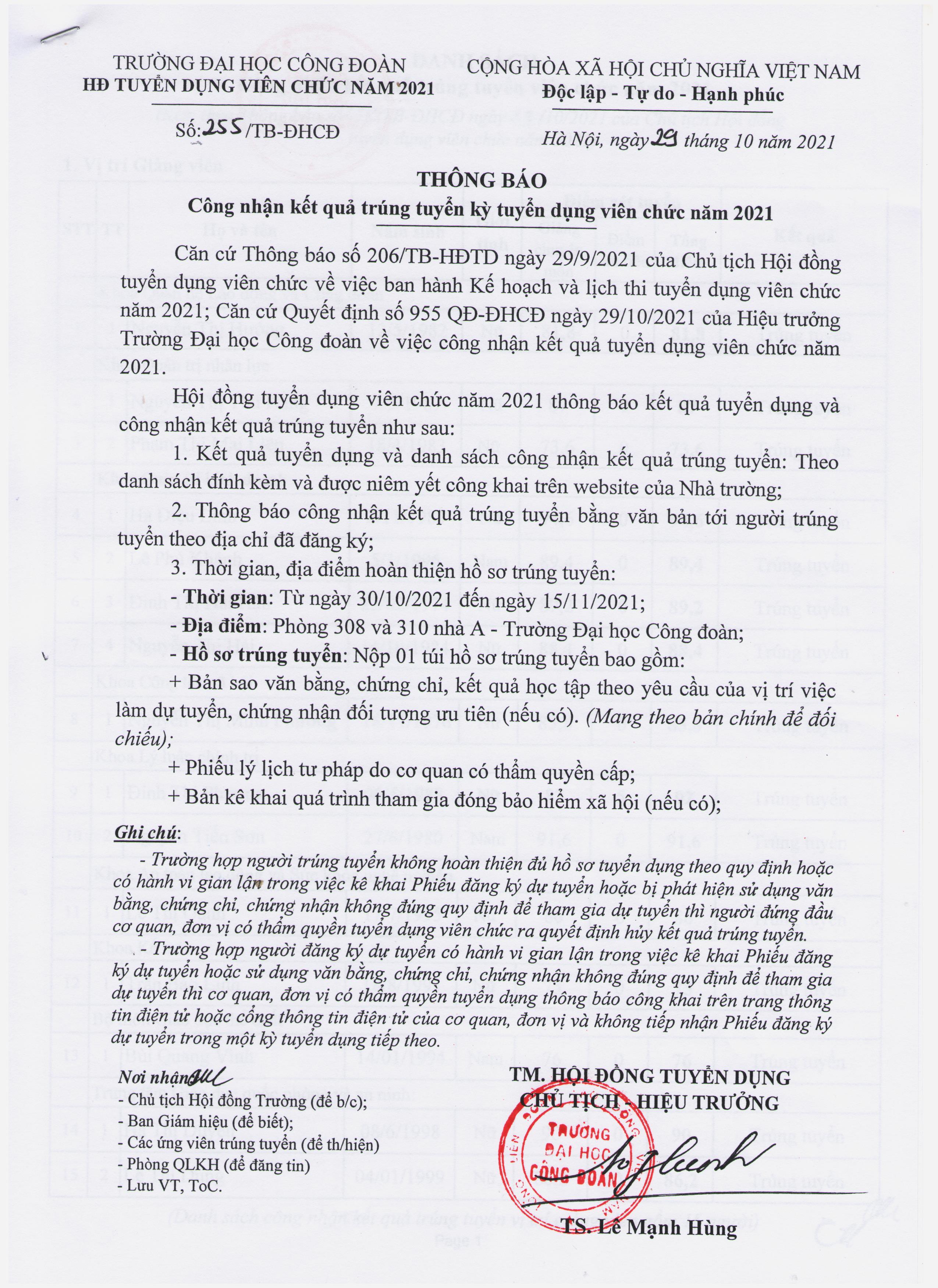 Thông báo công nhận kết quả trúng tuyển kỳ tuyển dụng viên chức năm 2021