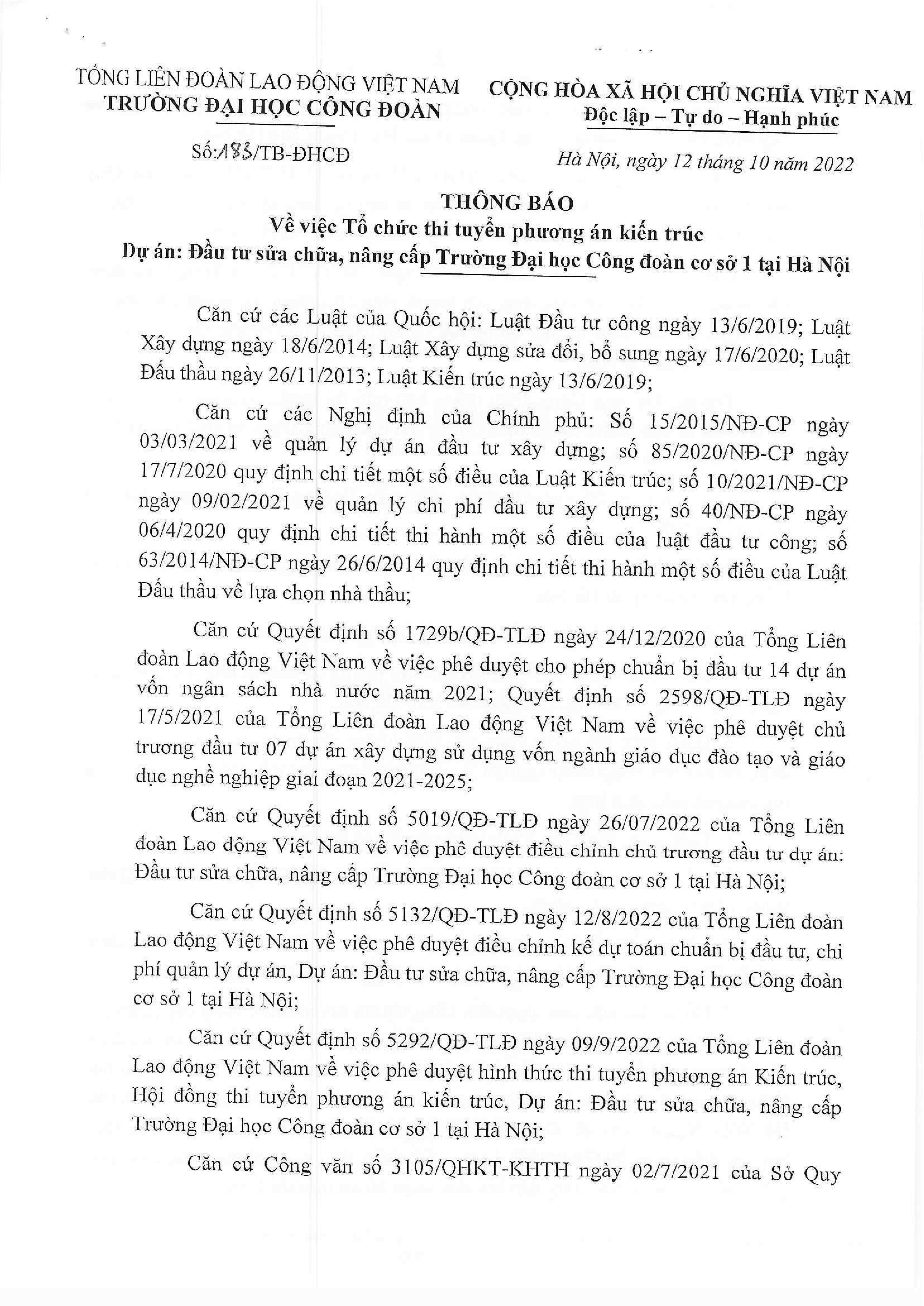 Về việc tổ chức thi phương án kiến trúc dự án đầu tư sửa chữa, nâng cấp trường Đại học Công Đoàn cơ sở I tại Hà Nội