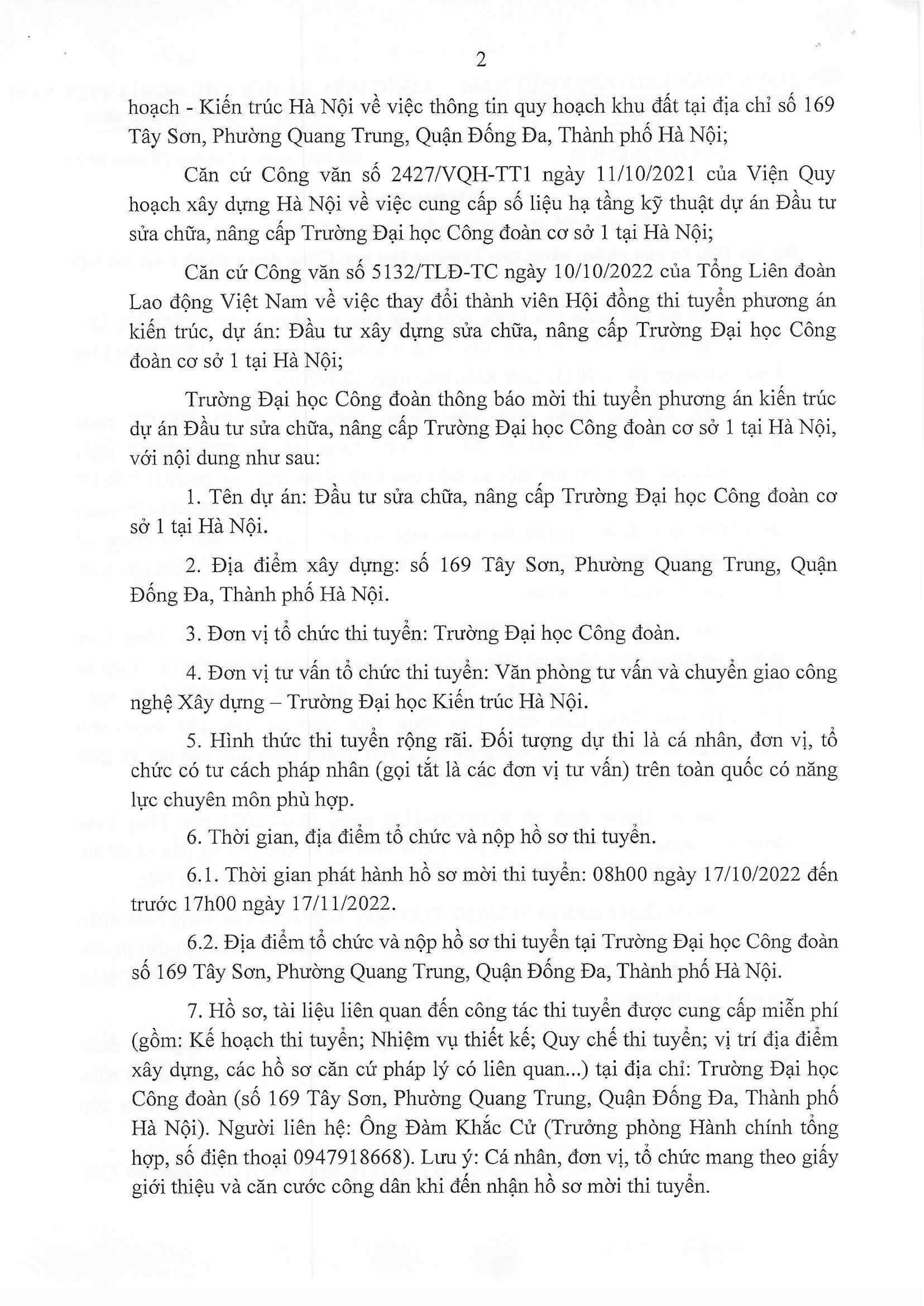 Về việc tổ chức thi phương án kiến trúc dự án đầu tư sửa chữa, nâng cấp trường Đại học Công Đoàn cơ sở II tại Hà Nội