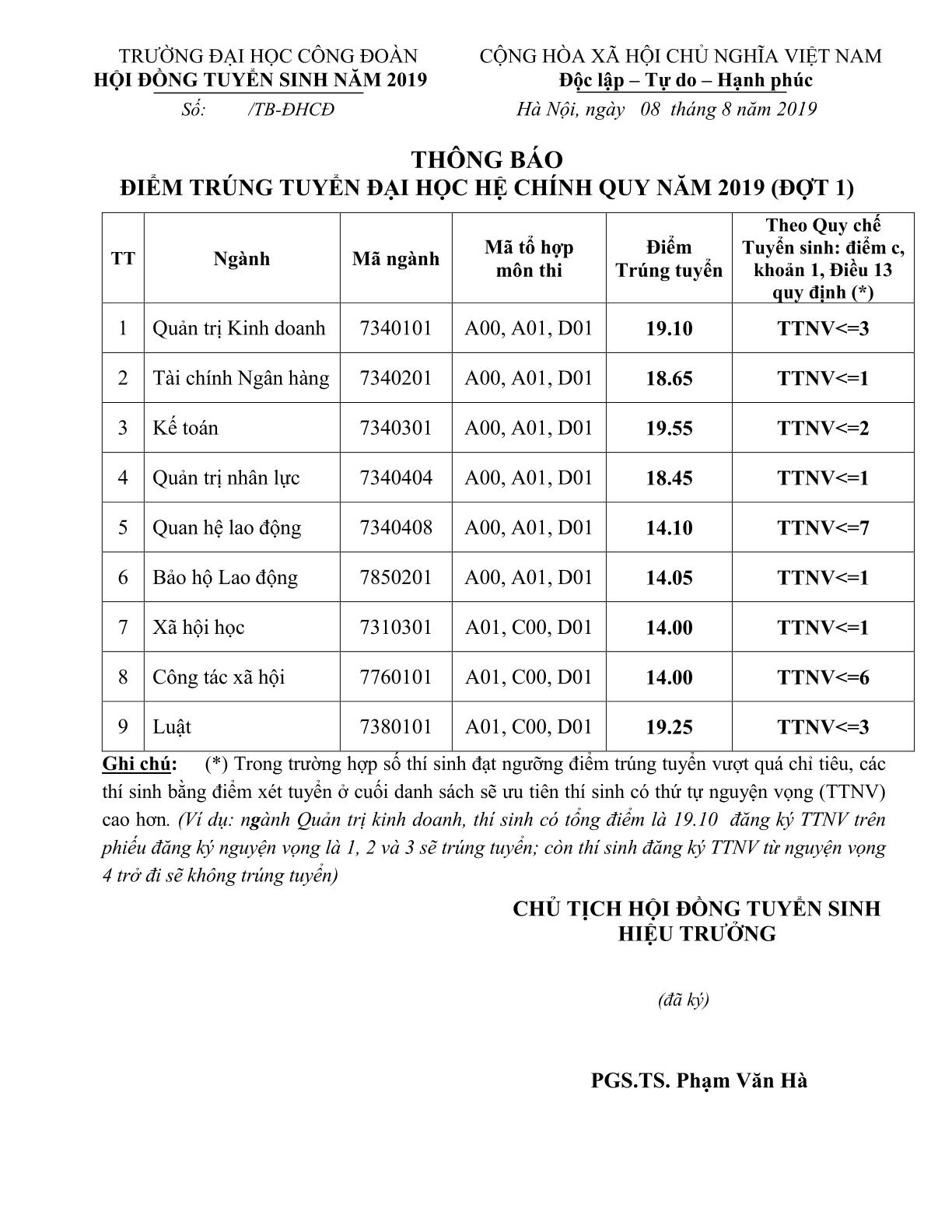 Thông báo điểm trúng tuyển Đại học hệ chính quy năm 2019 (đợt 1)
