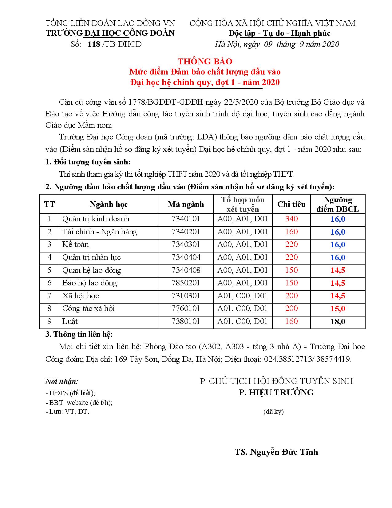 Thông báo mức điểm Đảm bảo chất lượng đầu vào Đại học hệ chính quy, đợt 1 - năm 2020