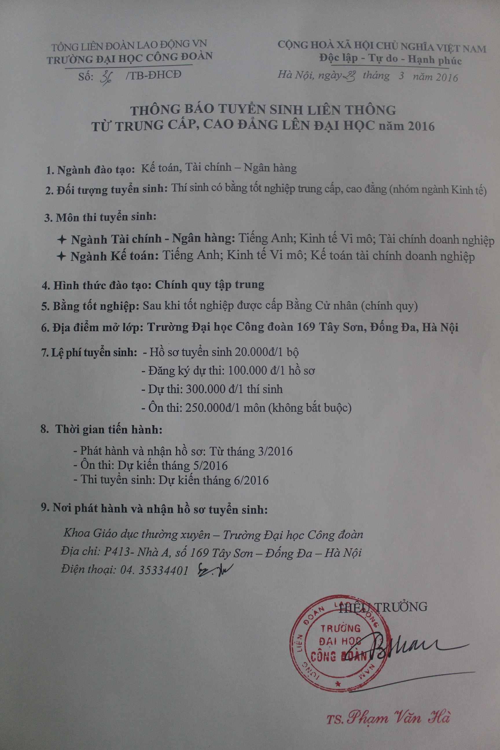Tuyển sinh liên thông từ Trung cấp, Cao đẳng lên Đại học năm 2016